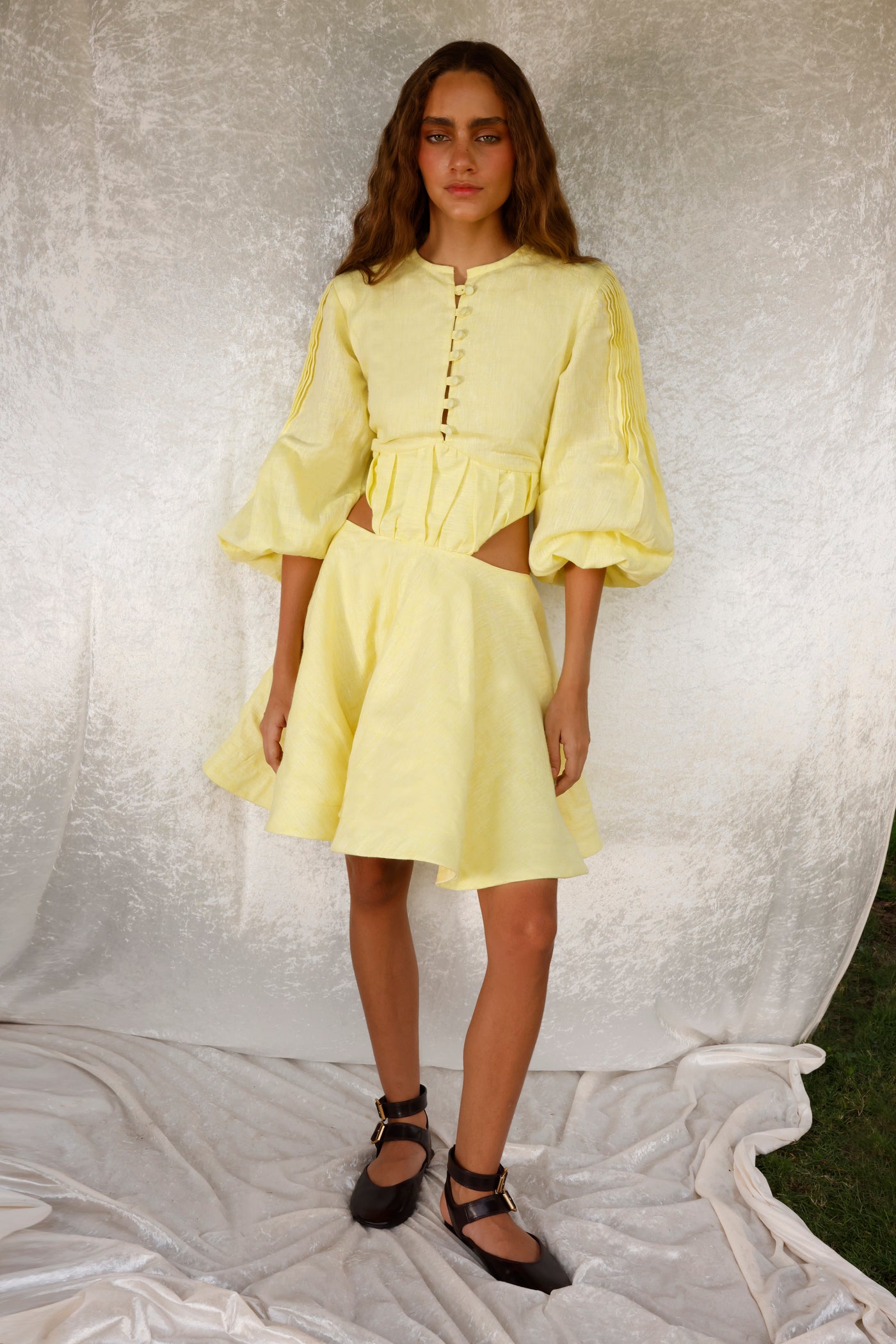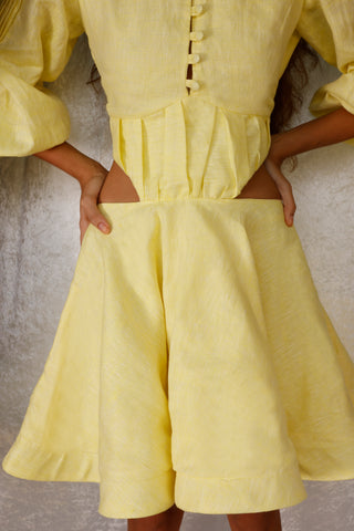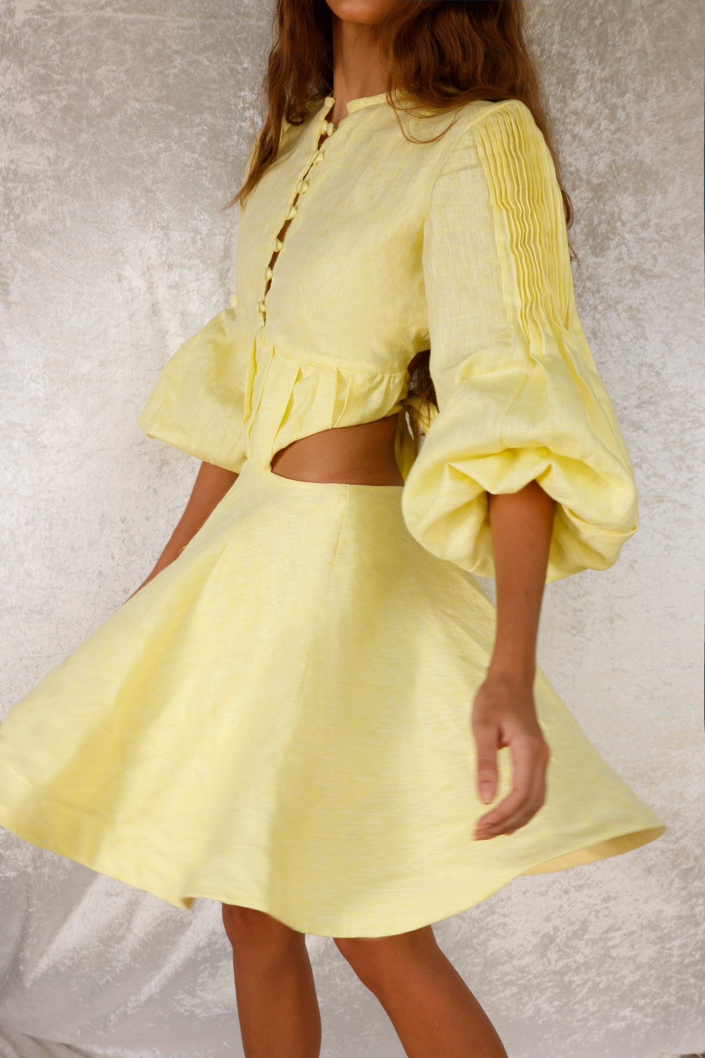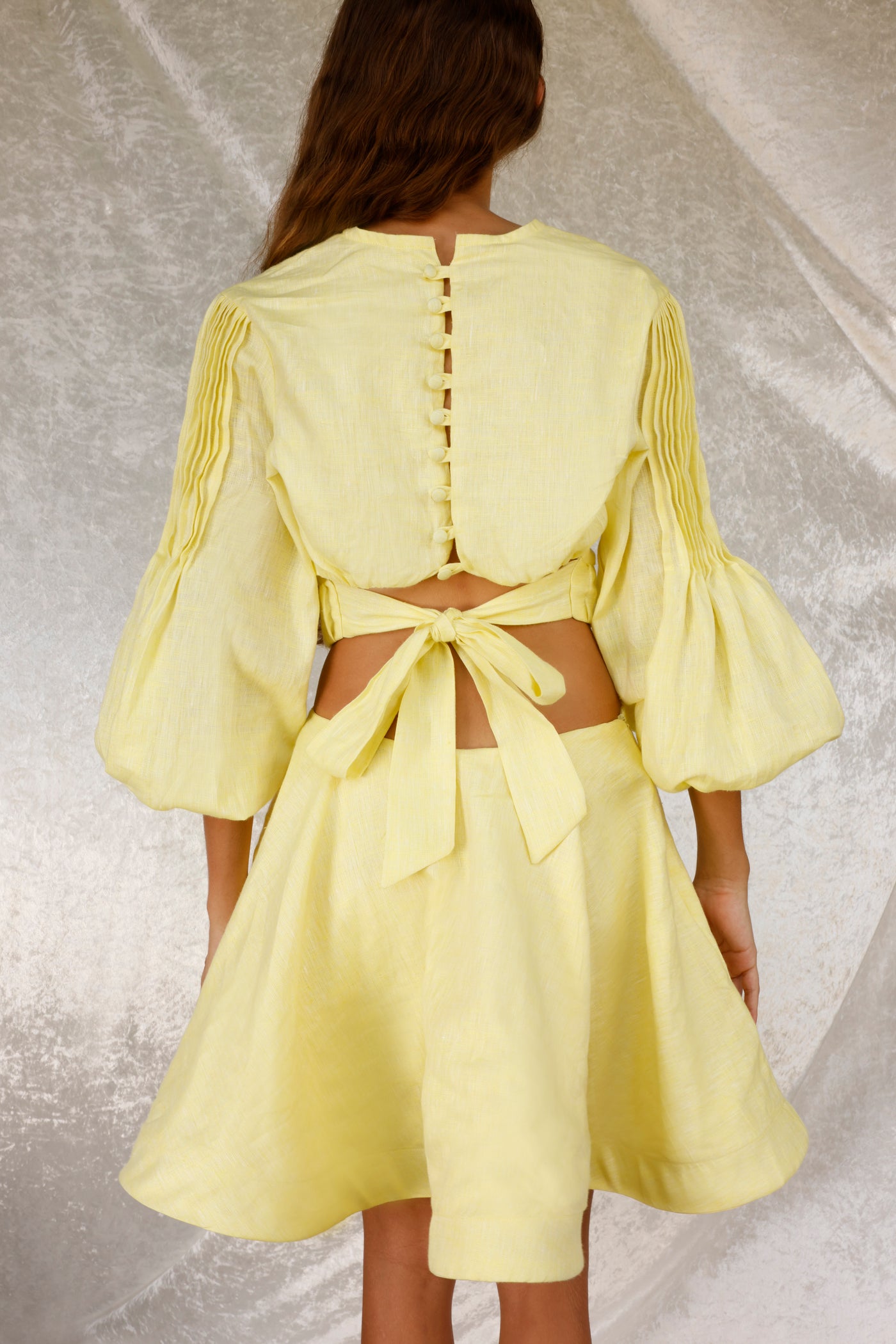 Vestido triquini manga larga en lino 100% y falda amplia detalles de alforzas en manga y lazo en espalda para un ajuste más preciso.